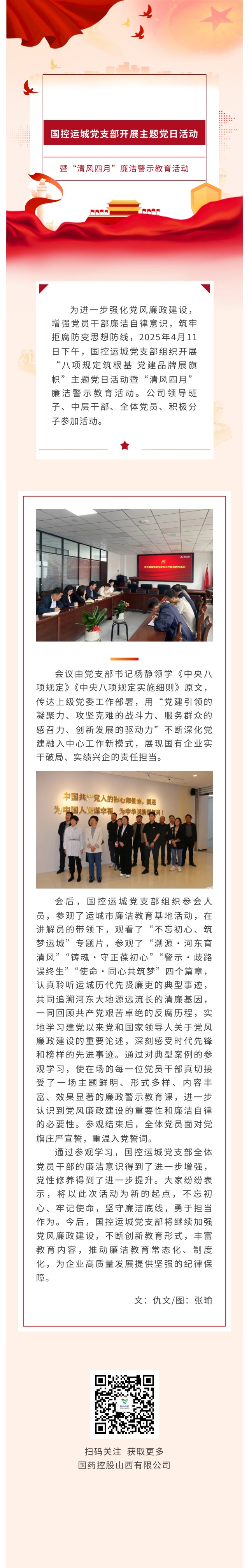 国控运城党支部开展主题党日活动暨“清风四月”廉洁警示教育活动