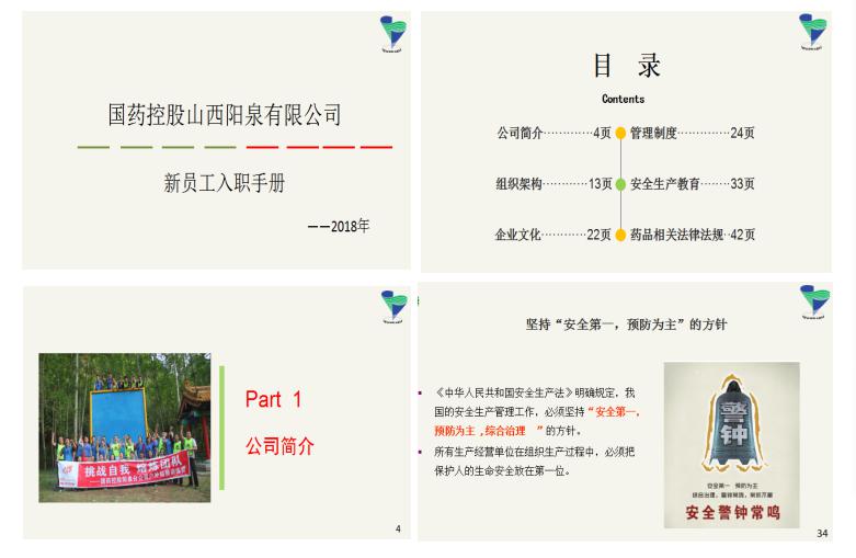 展开《新员工入职手册》,从企业简介引申到公司文化活动,再通过部门分工及岗位职责的讲解,使新员工对公司有了框架式的认识。随后从管理制度到安全教育,为新员工的日常行为做了指引性的规定。最后,通过《药品管理法》及GSP相关条款的讲解,使大家认识到我们行业的特殊性。