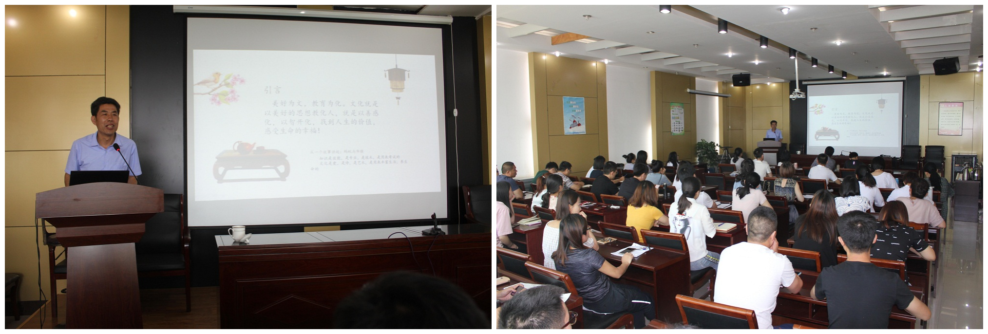 “美好为文,教育为化。文化就是以美好的思想教化人,就是以善感化,以智开化,找到人生的价值,感受生命的幸福!”授课开始,张老师以一段引言将大家带入文化课堂。课程中,张老师以其渊博的知识、丰富的阅历,将传统和现代文化相互融合,引经据典,娓娓道来。课堂上,大家屏息凝神,全神贯注,心情随着老师的授课起伏上下,感受了一场心灵和视觉的盛宴。
