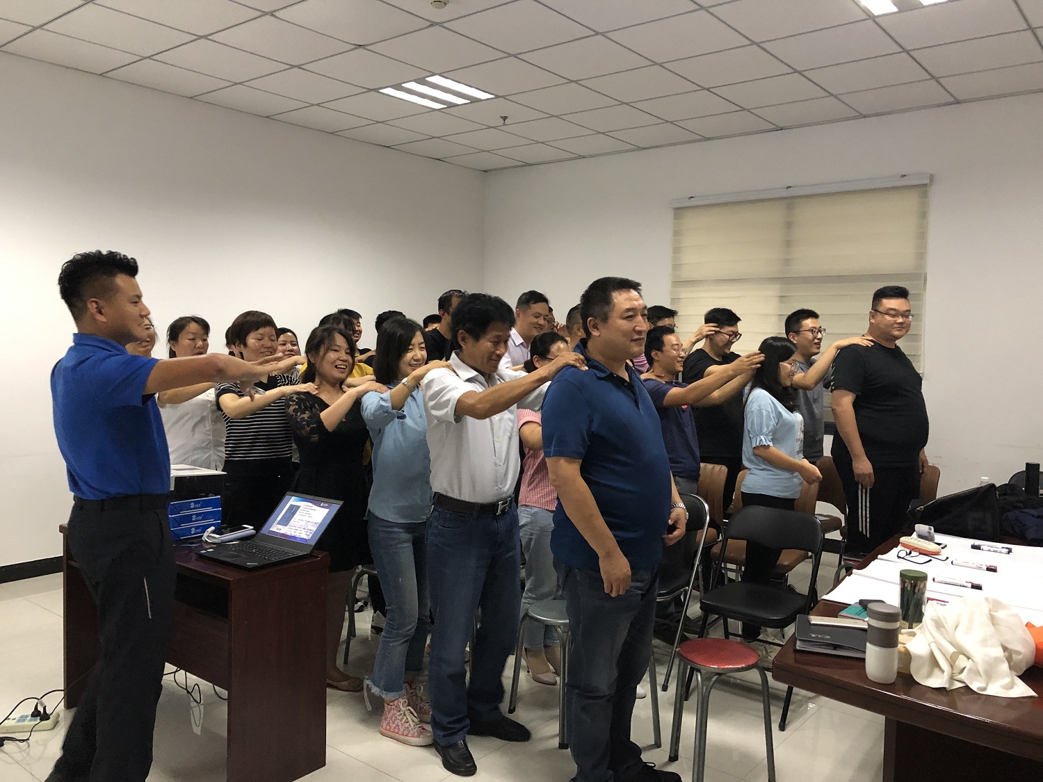 继9月28日徒步盐湖毅行活动之后,9月29日,星空在线-【官网】人力资源部部长、国药大学讲师姚晓霞及人合正道培训师巩企翔莅临运城分公司对公司全员进行了职场礼仪培训及团体建设训练。