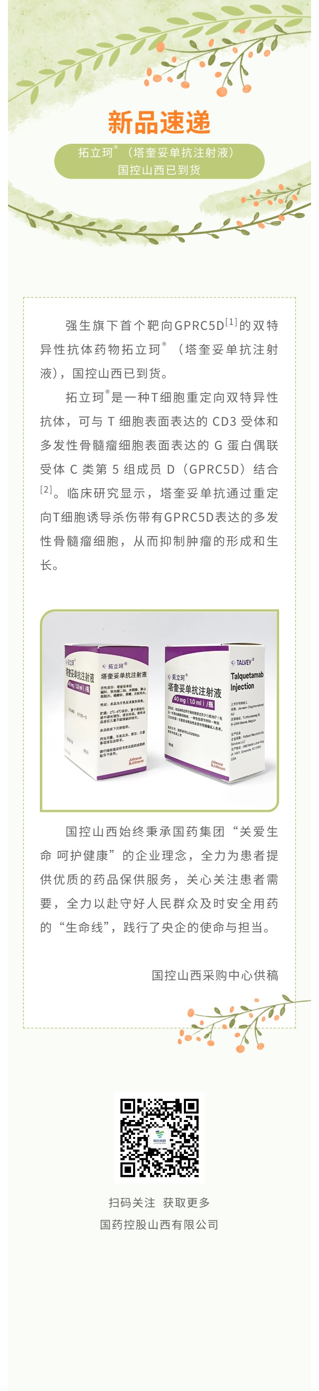 新品速递:拓立珂® (塔奎妥单抗注射液)国控山西已到货